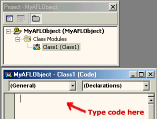 • Then double-click on the "Class1" in the project tree item. The code window will get the title of "MyAFLObject - Class1 (Code)" as shown below: