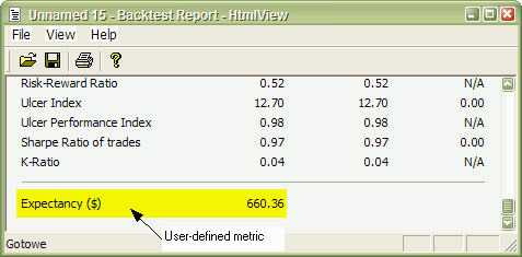 Now, when you run a backtest and click the Report button in the Automatic Analysis window, you will see your custom metric added at the bottom of the statistics page: