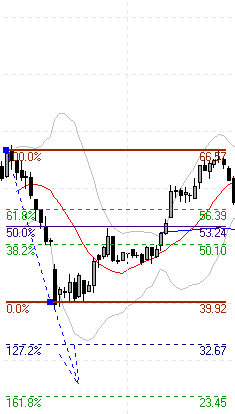 The time extension tool should be used as follows. First, click on the Fibonacci Time Extension button on the toolbar. Then, select the first range point (typically a major top or bottom of a market) by clicking on the chart where you want the range to begin; then, move the mouse pointer to select the second range point by again clicking on the chart where you want the range to end. Extension lines will now be drawn onto the future bars.