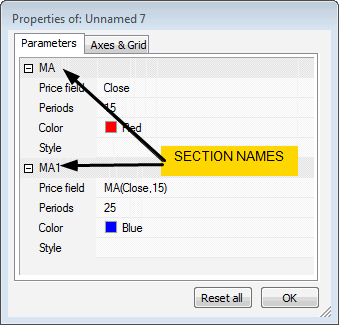 Last but not least, you should NOT remove _SECTION_BEGIN / _SECTION_END markers from the formula. If you do, AmiBroker will not be able to recognize sections inside a given formula anymore and parameters with the same name will interfere with each other.