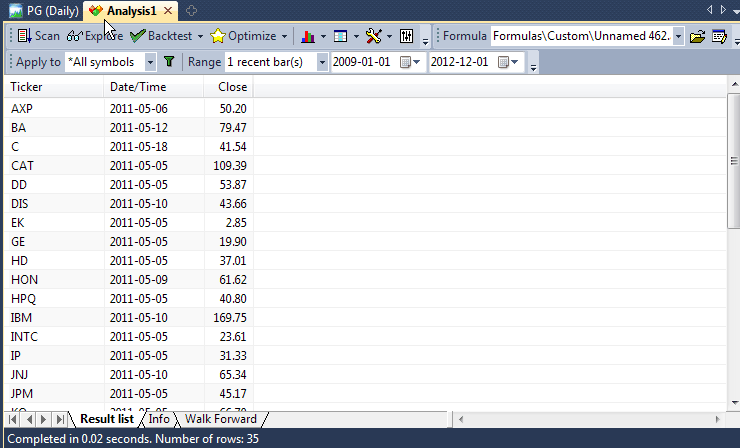 One of the most useful features of the Analysis window is called "Exploration". Basically, an exploration works in a similar way to Scan, but instead of looking for and reporting just buy/sell signals, it allows you to generate a customizable screening (or exploration) report that can give you much more information than a simple Scan.