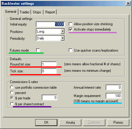 The Futures mode checkbox on the settings page (underscored with a green line in the picture above) is key to backtesting futures. It instructs the backtester to use margin deposit and point value in calculations.