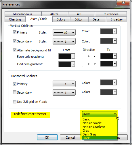 AmiBroker 5.52 introduces 6 pre-defined chart themes switchable in Tools->Preferences, "Axes & Grid" tab: