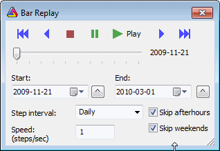 Skip after-hours - when turned on, playback skips hours outside regular trading hours as defined in File->Database Settings->Intraday Settings