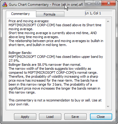 Commentaries are generated using formulas written in AmiBroker's own formula language. You can find the description of this language in AmiBroker Formula Language Reference Guide.