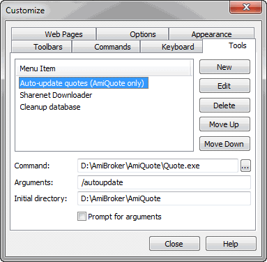 You can launch executable files (.exe), script files (.js, .vbs), web pages (.html), and any other registered file types from the tools menu. To add a new tool, you should open this dialog and click the "New" button. Then, enter the tool name, command (by hand or using the file dialog), optional arguments, and the initial directory. If you check the "Prompt for arguments" checkbox, AmiBroker will ask for the program's arguments each time.