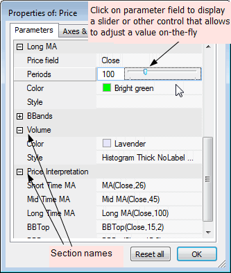 This window allows the user to modify parameters specified in the AFL formula via Param, ParamStr, ParamColor, ParamStyle, ParamField, ParamToggle, ParamDate, ParamTime, ParamList functions and also to adjust axes and grid settings.