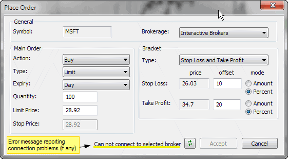 The Status field (highlighted in yellow) shows the connection status between AmiBroker and the trading interface. Any connection error will be displayed here, and in case of an error, AmiBroker will disable the "Accept" button and will attempt to reconnect every 5 seconds. You can also manually trigger a reconnection attempt by pressing the button with two green arrows.